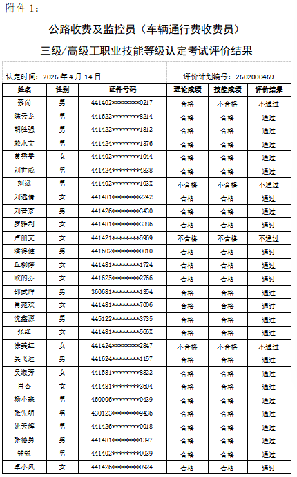 广东省高速公路发展促进会(以下简称“省高促会”)于2026年4月在河源市东源县义合考点组织开展了公路收费及监控员(车辆通行费收费员)三级、四级职业技能等级认定考试,并已完成理论知识和技能实操评价工作,现将评价结果予以公示,同时开通成绩查询服务。