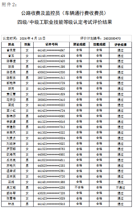 广东省高速公路发展促进会(以下简称“省高促会”)于2026年4月在河源市东源县义合考点组织开展了公路收费及监控员(车辆通行费收费员)三级、四级职业技能等级认定考试,并已完成理论知识和技能实操评价工作,现将评价结果予以公示,同时开通成绩查询服务。